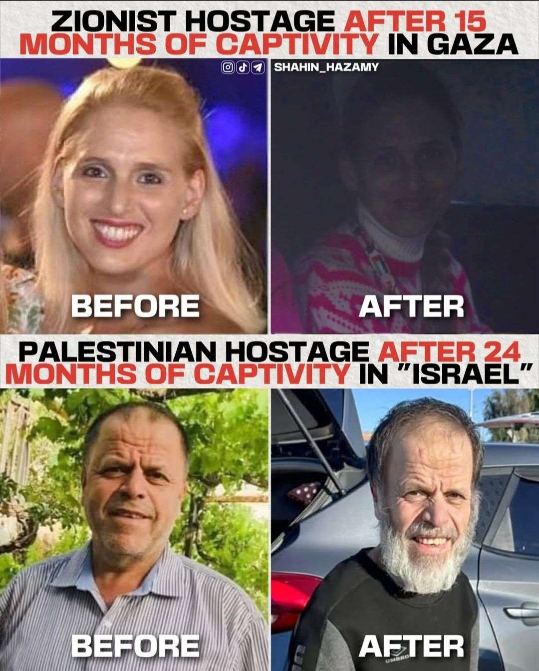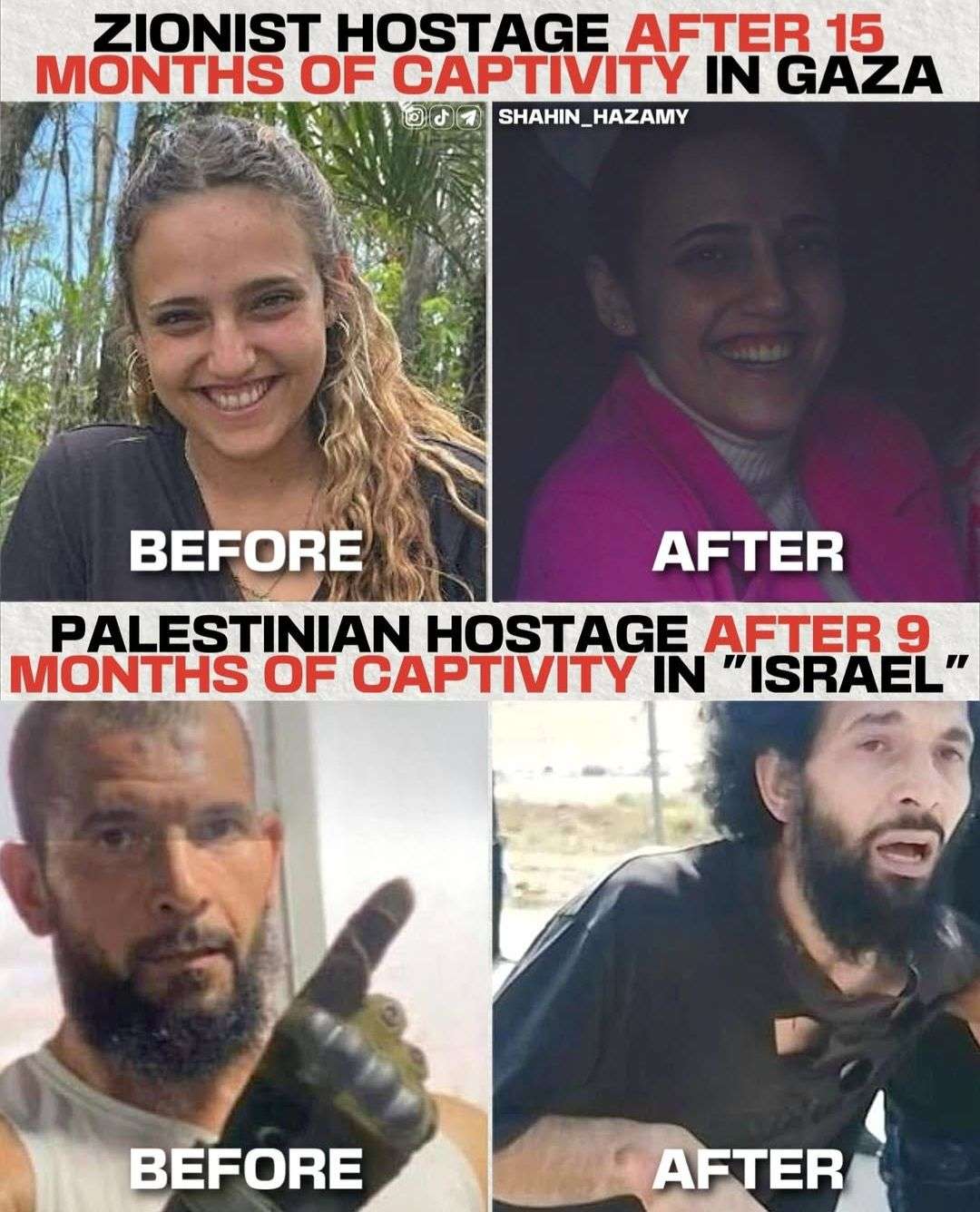 الإفراج الأخير عن ثلاث شابات إسرائيليات، بدت وجوههن مبتسمة وفي حالة صحية جيدة، سلط الضوء على واقع مقلق: الفجوة الواضحة بين معاملة الأسرى الإسرائيليين من قِبل حركة حماس ومعاملة المعتقلين الفلسطينيين من قِبل إسرائيل. فهؤلاء الشابات، رغم ظروف احتجازهن، ظهرن بحالة سليمة جسديًا ونفسيًا. صورة تتناقض تماما مع حالة الأسرى الفلسطينيين الذين يعودون إلى عائلاتهم وقد أنهكتهم المعاناة، أجسادهم نحيلة وعلامات الإرهاق النفسي والجسدي واضحة عليهم.