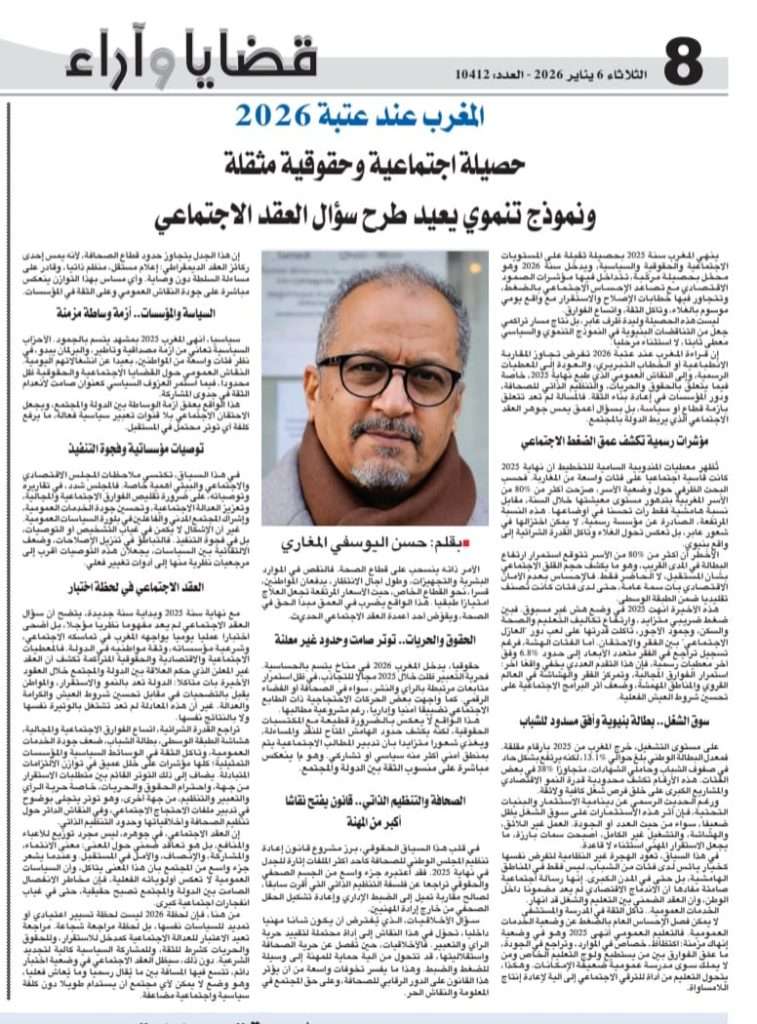 إن قراءة المغرب عند عتبة 2026 تفرض تجاوز المقاربة الانطباعية أو الخطاب التبريري، والعودة إلى المعطيات الرسمية، وإلى النقاش العمومي الذي طبع نهاية 2025، خاصة فيما يتعلق بالحقوق والحريات، والتنظيم الذاتي للصحافة، ودور المؤسسات في إعادة بناء الثقة. فالمسألة لم تعد تتعلق بأزمة قطاع أو سياسة، بل بسؤال أعمق يمس جوهر العقد الاجتماعي الذي يربط الدولة بالمجتمع.